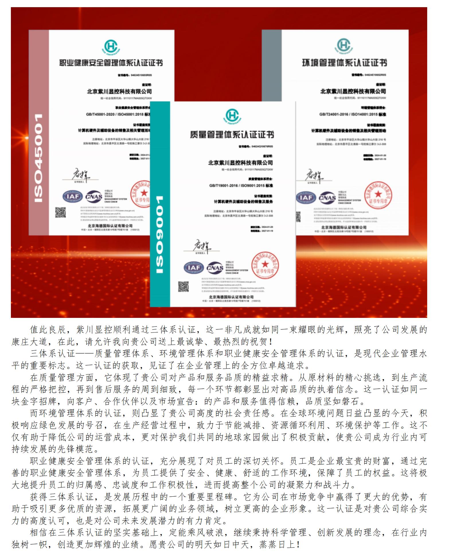 《贺喜北京紫川显控科技有限公司获三体系认证