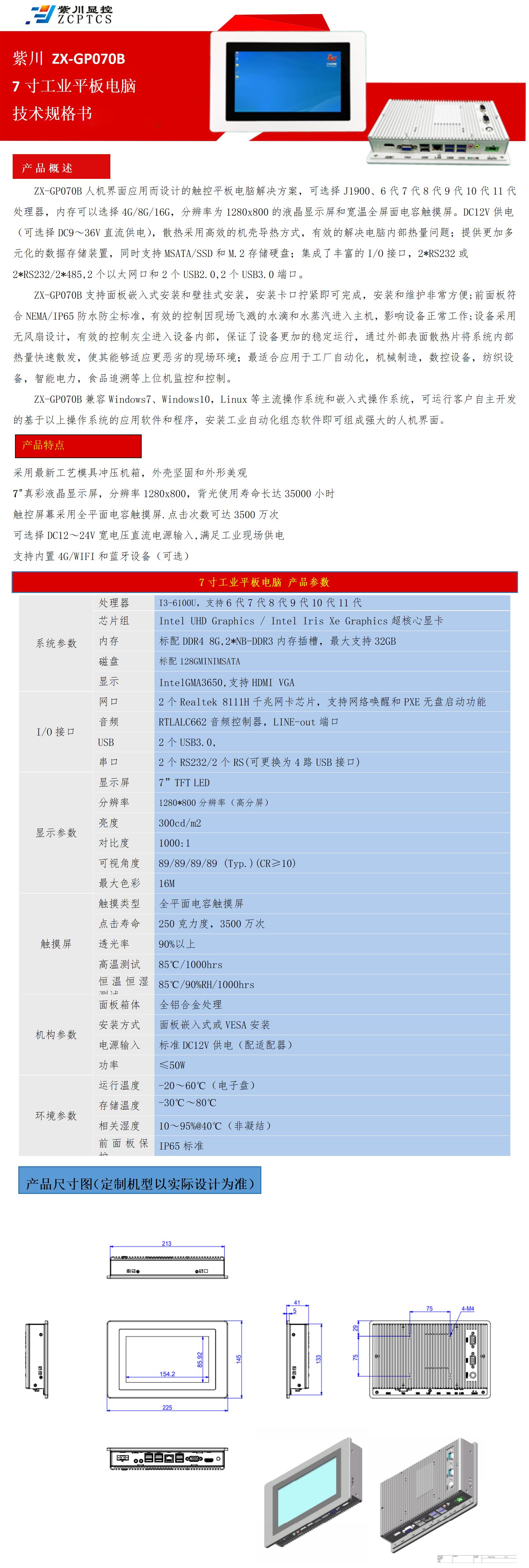 ZX-GP070B人机界面应用而设计的触控平板电脑解决方案,可选择J1900、6代7代8代9代10代11代处理器,内存可以选择4G/8G/16G,分辨率为1280x800的液晶显示屏和宽温全屏面电容触摸屏。DC12V供电(可选择