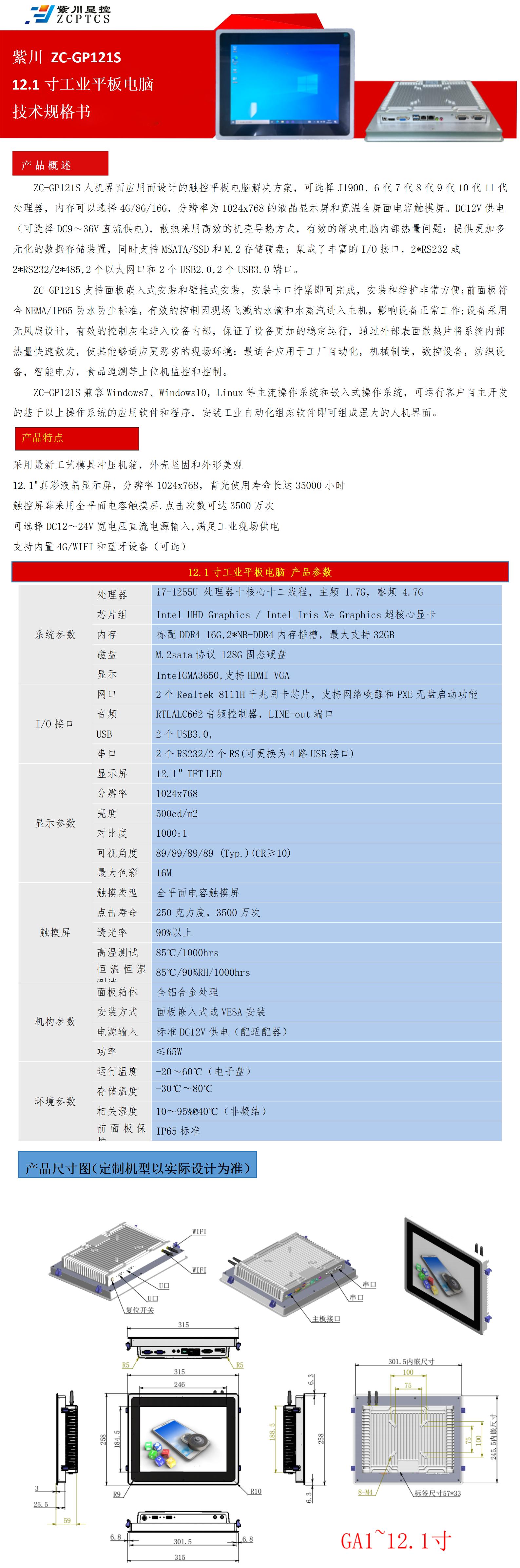12.1寸工业一体机、工业平板电脑嵌入式安装