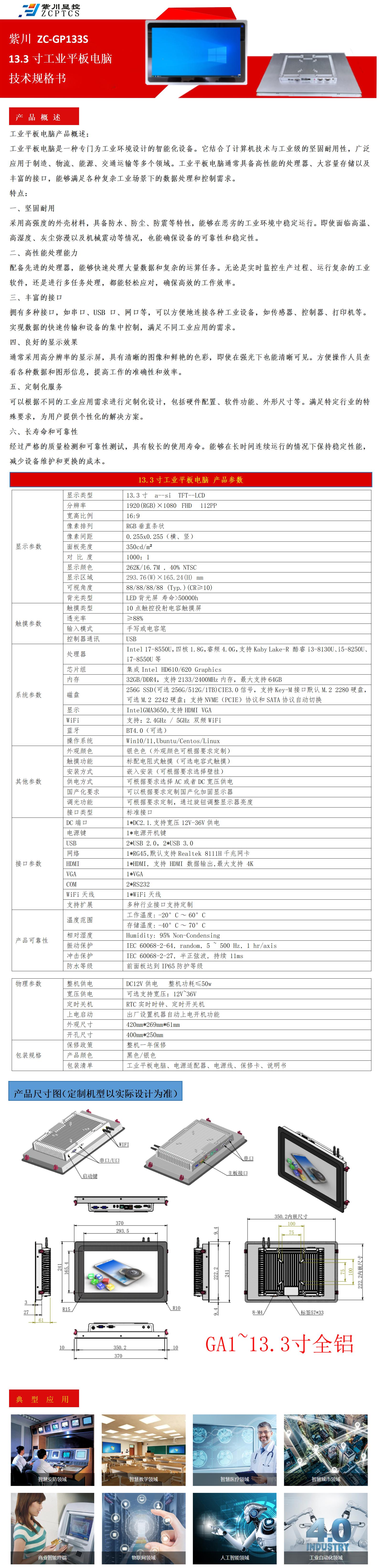 13.3寸工业一体机,嵌入式安装、工业用平板电脑
