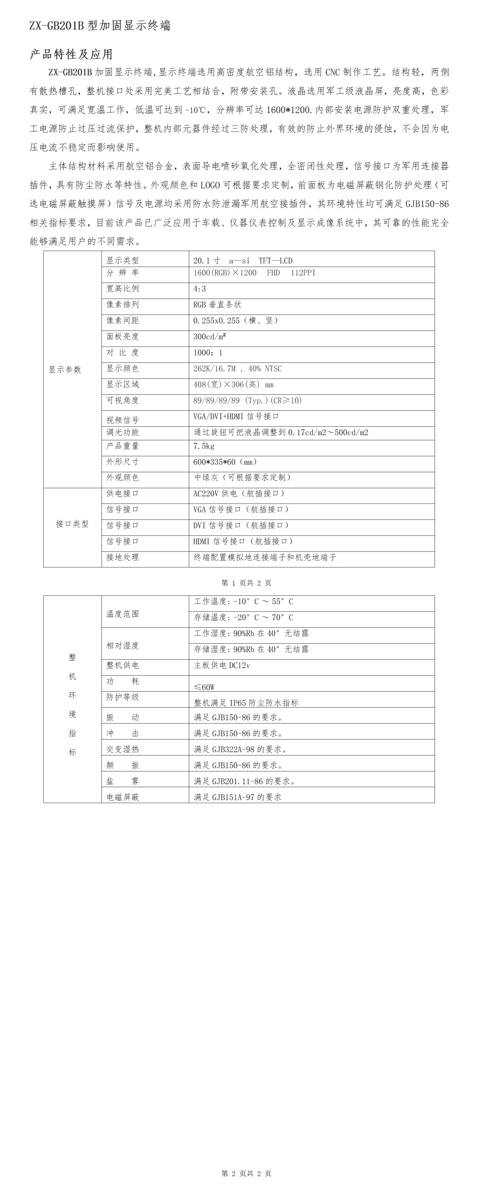 产品特点 ZX-GB201B加固显示终端,采用高密度航空铝铣加钣金结构组合成型,结构轻,两侧有散热槽孔(加配防尘网),整机接口处采用完美工艺相结合,采用专业电连接器,带钢化玻璃,