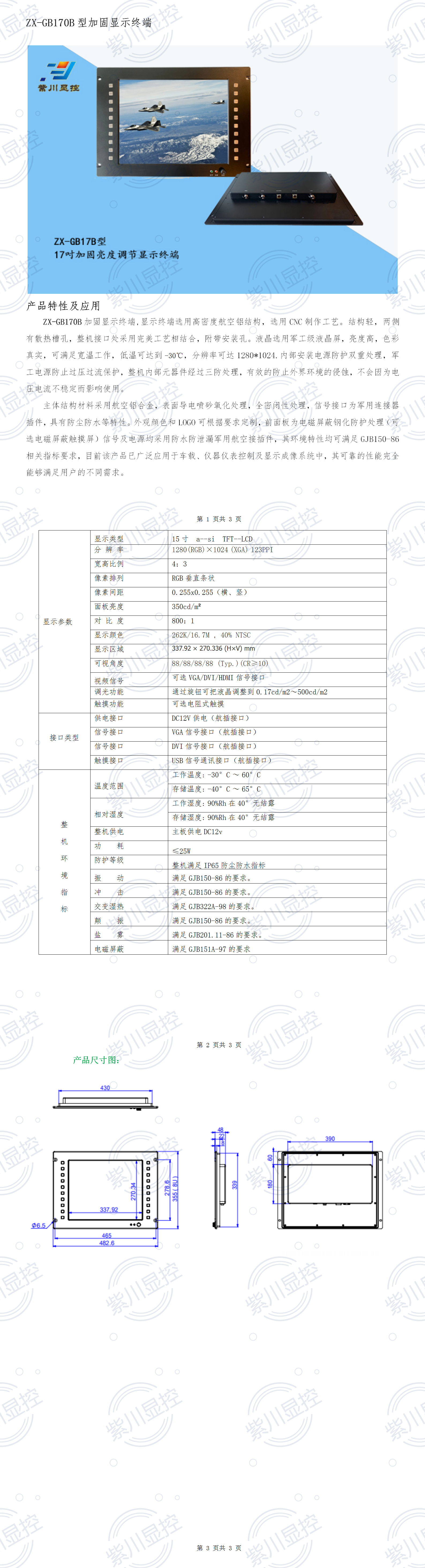 产品特点 ZX-GB17B加固显示终端,采用高密度航空铝铣加钣金结构组合成型,结构轻,两侧有散热槽孔(加配防尘网),整机接口处采用完美工艺相结合,采用专业电连接器,带屏蔽钢化玻璃