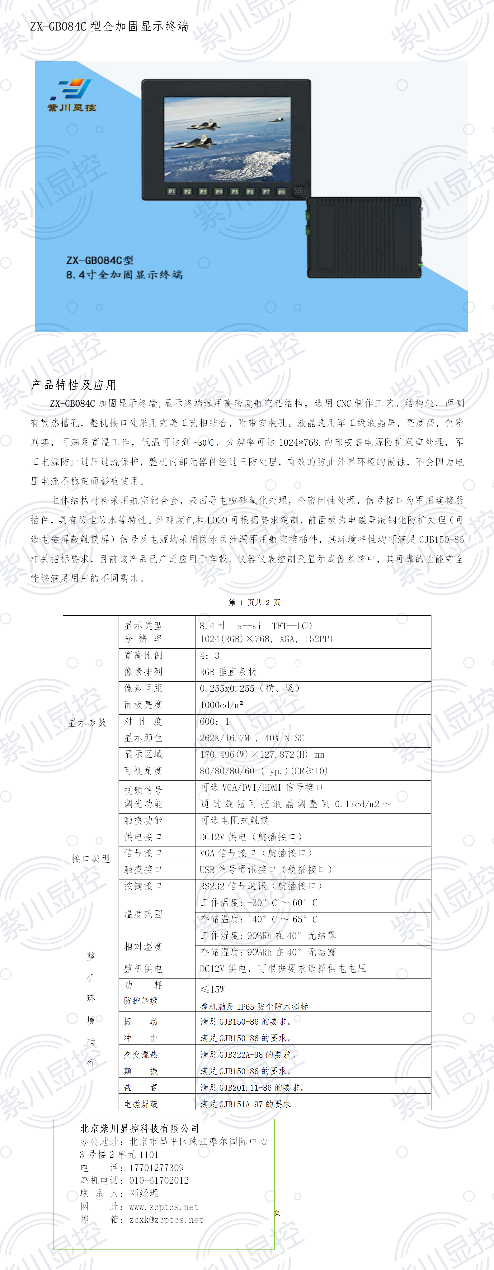 产品特点 ZX-GB084C加固显示终端,采用高密度航空铝铣加钣金结构组合成型,结构轻,两侧有散热槽孔(加配防尘网),整机接口处采用完美工艺相结合,采用专业电连接器,带屏蔽钢化玻
